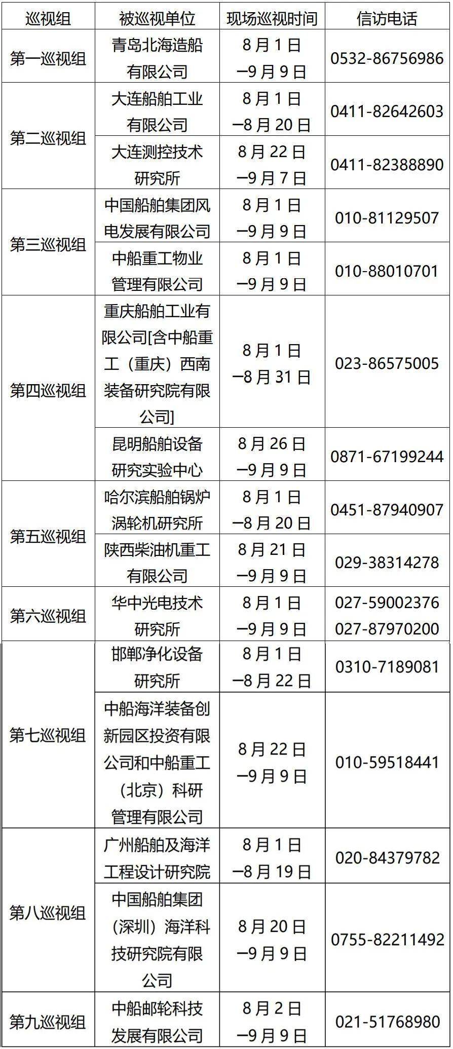 根據(jù)中國(guó)船舶集團(tuán)黨組2022年第一輪巡視工作部署,截至2022年8月2日,中國(guó)船舶集團(tuán)黨組9個(gè)巡視組已進(jìn)駐青島北海造船有限公司、大連船舶工業(yè)有限公司、中國(guó)船舶集團(tuán)風(fēng)電發(fā)展有限公司、中船重工物業(yè)管理有限公司、重慶船舶工業(yè)有限公司[含中船重工(重慶)西南裝備研究院有限公司]、哈爾濱船舶鍋爐渦輪機(jī)研究所、華中光電技術(shù)研究所、邯鄲凈化設(shè)備研究所、廣州船舶及海洋工程設(shè)計(jì)研究院、中船郵輪科技發(fā)展有限公司等單位,對(duì)其黨組織開(kāi)展為期40天左右的現(xiàn)場(chǎng)巡視。巡視期間,巡視組設(shè)置專(zhuān)門(mén)值班電話(具體如下表)。同時(shí)在巡視組工作現(xiàn)場(chǎng)設(shè)置聯(lián)系信箱,廣大干部職工可以反映情況。