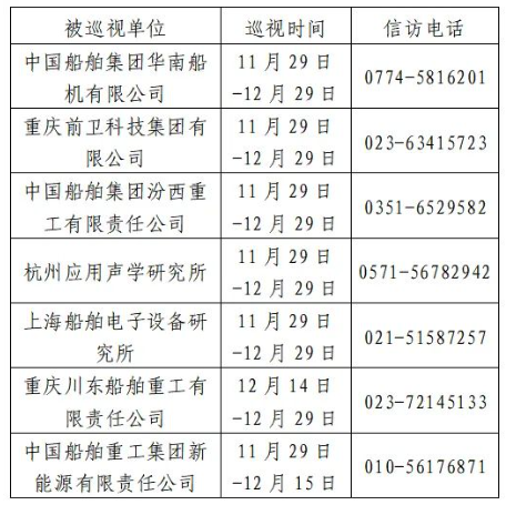 根據(jù)中國船舶集團黨組2023年第二輪巡視工作部署,截至2023年11月29日,巡視工作已經(jīng)鋪開。其中,對中國船舶集團華南船機有限公司、重慶前衛(wèi)科技集團有限公司、中國船舶集團汾西重工有限責任公司、杭州應用聲學研究所、上海船舶電子設(shè)備研究所等5家單位開展常規(guī)巡視,對重慶川東船舶重工有限責任公司、中國船舶重工集團新能源有限責任公司等2家單位開展專項巡視。