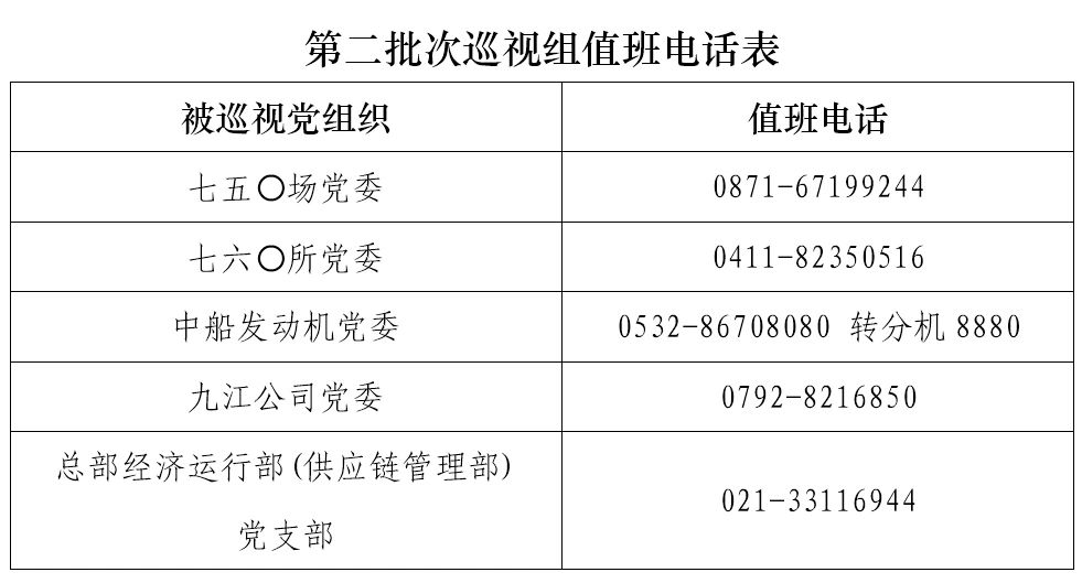 巡視期間,集團(tuán)公司黨組巡視組設(shè)置值班電話和聯(lián)系信箱,主要受理反映被巡視黨組織領(lǐng)導(dǎo)班子及其成員、下一級黨組織領(lǐng)導(dǎo)班子主要負(fù)責(zé)人和重點(diǎn)崗位領(lǐng)導(dǎo)干部問題的來信、來電、來訪,重點(diǎn)關(guān)注違反政治紀(jì)律、組織紀(jì)律、廉潔紀(jì)律、群眾紀(jì)律、工作紀(jì)律、生活紀(jì)律以及巡視整改等方面問題反映。第二批次巡視受理信訪截止時間為8月18日。