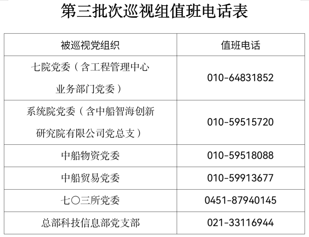 巡視期間,集團公司黨組巡視組設(shè)置值班電話和聯(lián)系信箱,主要受理反映被巡視黨組織領(lǐng)導(dǎo)班子及其成員、下一級黨組織領(lǐng)導(dǎo)班子主要負(fù)責(zé)人和重點崗位領(lǐng)導(dǎo)干部問題的來信、來電、來訪,重點關(guān)注違反政治紀(jì)律、組織紀(jì)律、廉潔紀(jì)律、群眾紀(jì)律、工作紀(jì)律、生活紀(jì)律以及巡視整改等方面問題反映。第三批次巡視受理信訪截止時間為9月22日。